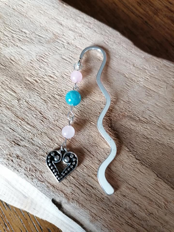 Ce marque-page est accompagné de quartz rose et d’apatite. Un coeur y est accrochée.