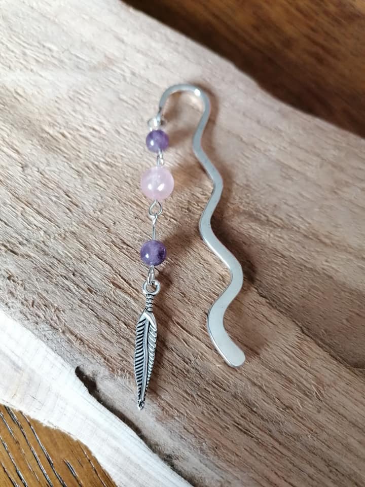 Ce marque-page est accompagné d’Améthyste et de quartz rose. Une petite plume y est accrochée.